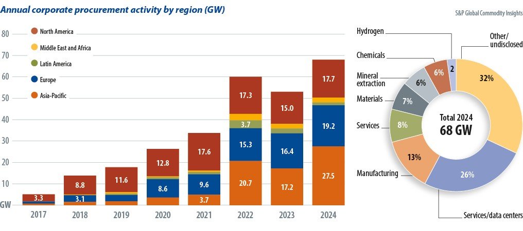 Corporate power purchase agreements (PPAs) continue to expand. Global corporate clean energy procurement hit a record 68 GW in 2024, up 29 % year-on-year, driven by data centers and technology firms, according to S&P Global Commodity Insights. Solar remains the preferred technology due to faster permitting and construction timelines.