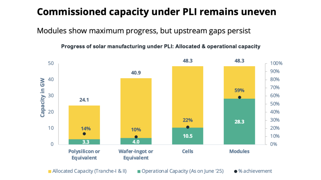 At the same time, upstream manufacturing remains weak. Whatever limited polysilicon and wafer capacity exists in India has emerged only through the PLI scheme. This highlights continued reliance on imports. About 36% of cell capacity and 24% of module capacity currently stem from PLI allocations.