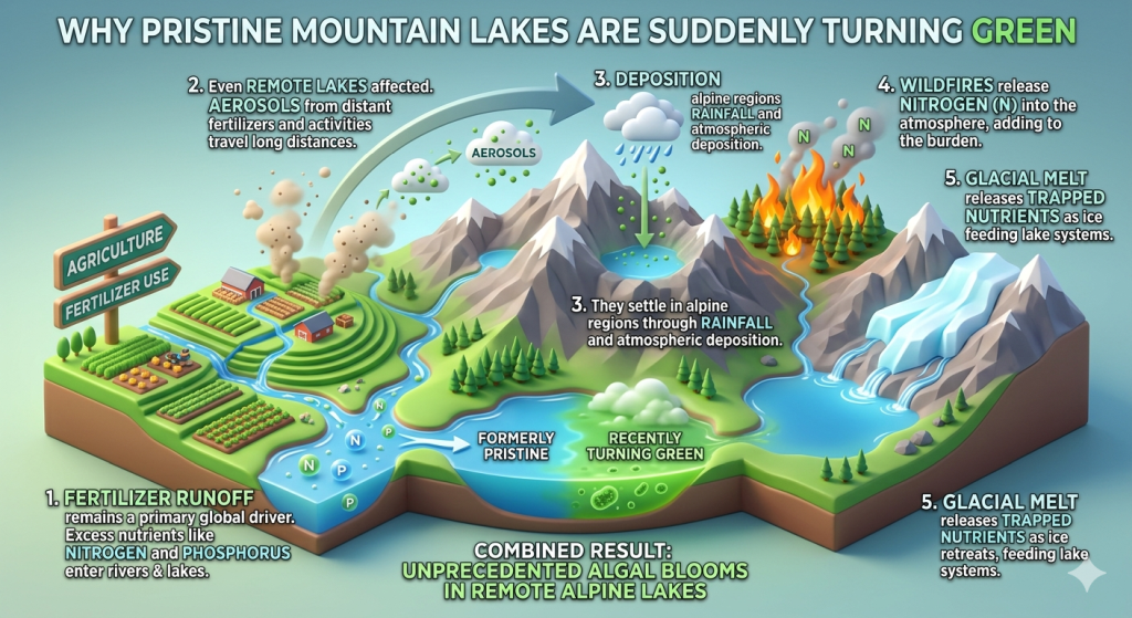 The causes are layered. Fertilizer runoff remains the primary driver worldwide. Nutrients like nitrogen and phosphorus enter rivers and lakes. However, even remote mountain lakes are being affected. Aerosols from fertilizers travel long distances. They settle in alpine regions through rainfall. Wildfires add to the burden by releasing nitrogen into the atmosphere. Glacial melt also plays a role. As ice retreats, trapped nutrients are released into lake systems.