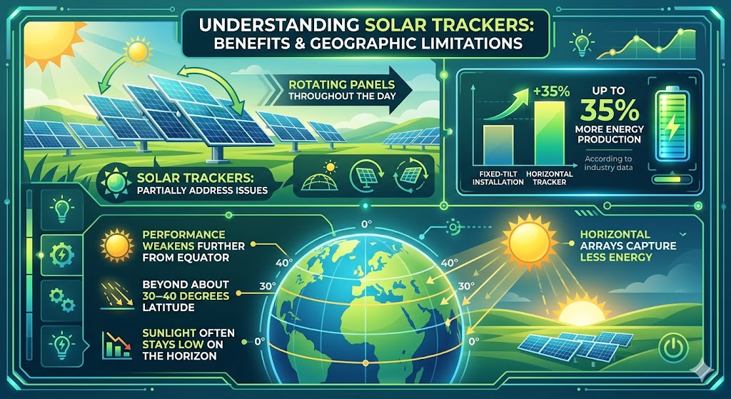 Solar trackers partially address the issue. These systems rotate panels throughout the day. Horizontal trackers can produce up to 35% more energy than fixed-tilt installations, according to industry data.