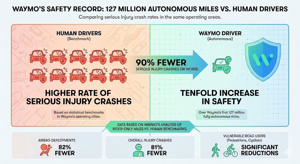 Waymo pushed back and stressed that its system remains the primary authority. It said that during its first 127 million fully autonomous miles, its vehicles recorded 90 percent fewer serious injury crashes or worse than human drivers in the same areas — a tenfold increase in safety.